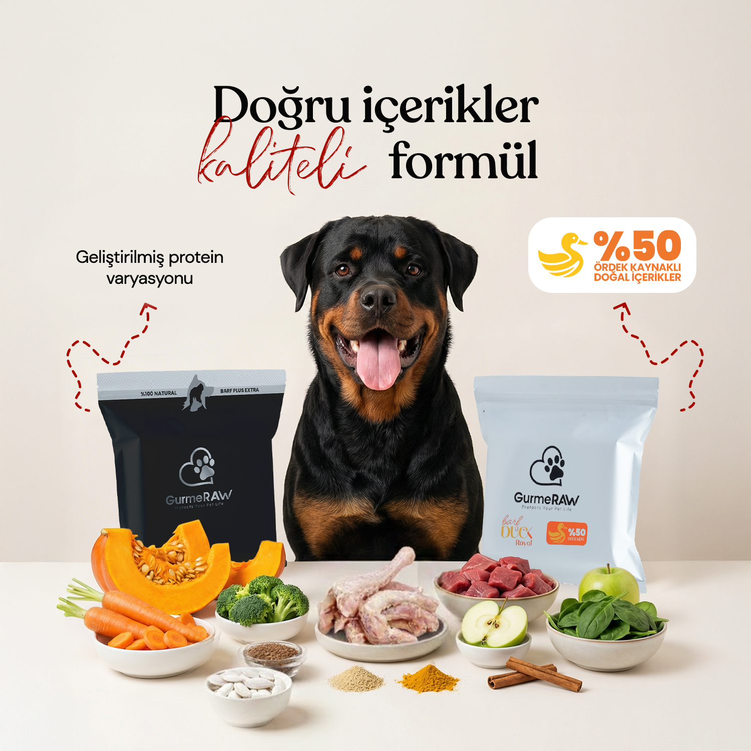 Bu yarı yarıya paket, Barf Duck Royal ve Barf Plus Extra formüllerinin içeriklerinden oluşur. Her iki ürünün detaylı içerik bilgisine kendi ürün sayfalarından ulaşabilirsiniz.