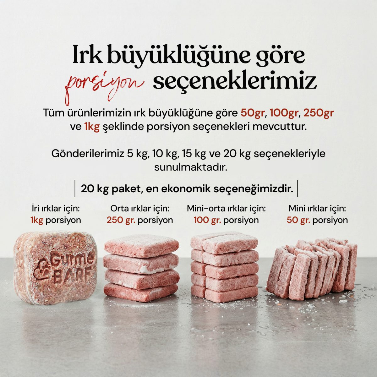 • Küçük ırklar için 50 Gr veya 100 Gr'lık porsiyonlarla farklı kombinasyonlar oluşturabilirsiniz (örneğin 50 Gr x 3 Adet).