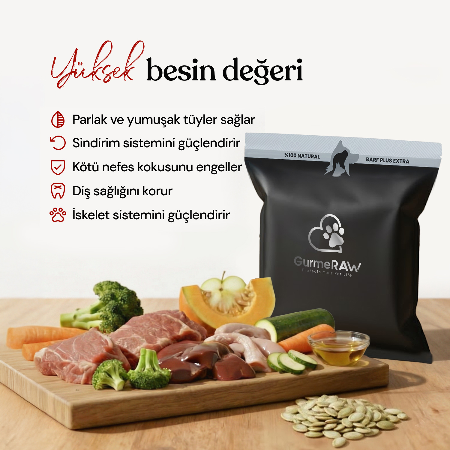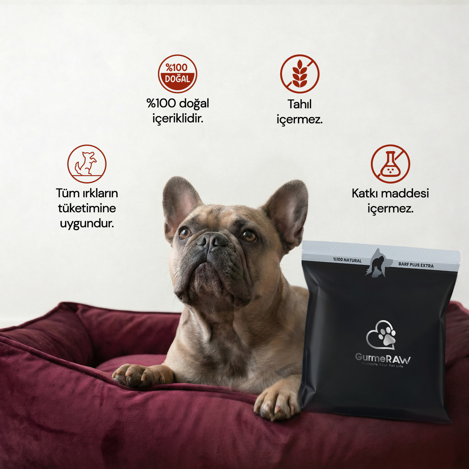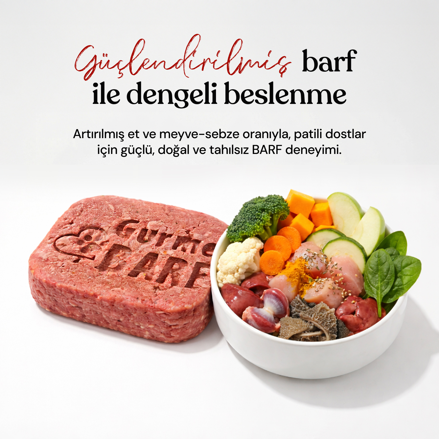 Genel olarak, üretiminde tahıl–sebze oranı yüksek ve et oranı düşük olan kuru mamaların aksine, et oranı daha yüksek, tahıl–sebze oranı minimum olan beslenme tarzına barf beslenme denir. Kedi ve köpeklerin etobur yapısı düşünüldüğünde, et ağırlıklı barf diyeti, doğal biyolojik beslenmeye son derece uygundur. GurmeRAW ürünlerinde hiçbir kimyasal, koruyucu, renklendirici ve tahıl kullanılmamaktadır.