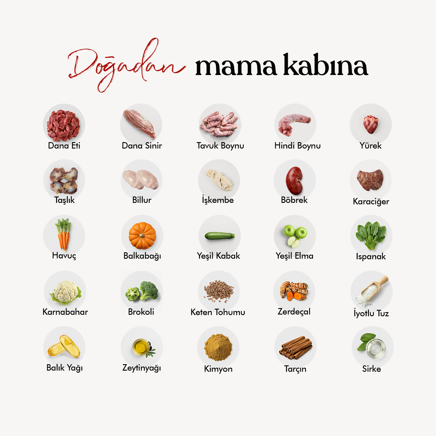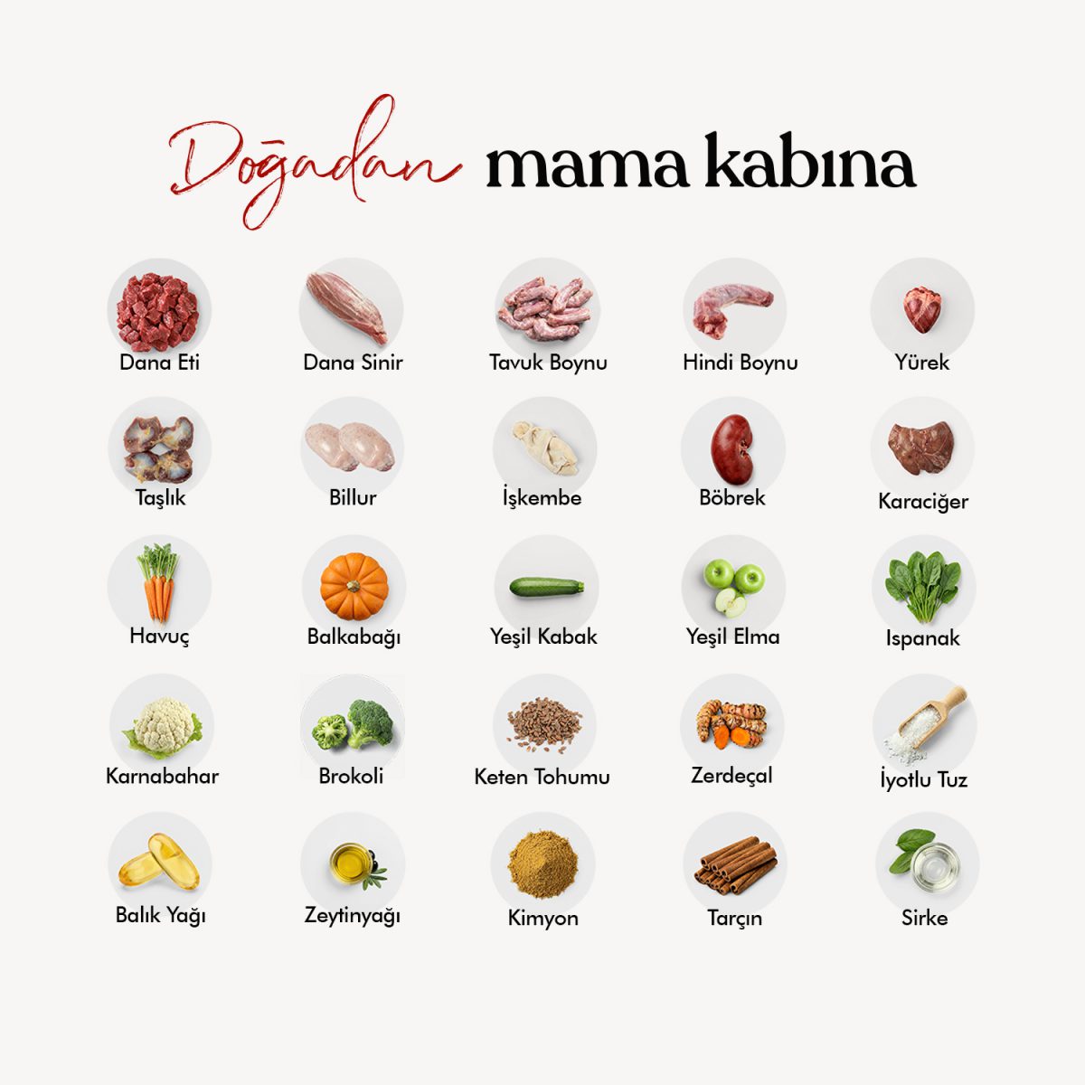 Dana kas etleri, tavuk boynu ve hindi boynu ile zengin sakatat içeriği; yürek, karaciğer, böbrek, taşlık, billur, işkembe, elma, havuç, yeşil kabak, balkabağı, karnabahar, brokoli, ıspanak, balık yağı, zeytinyağı, keten tohumu, zerdeçal, sirke, tuz, tarçın ve kimyon içerir.
