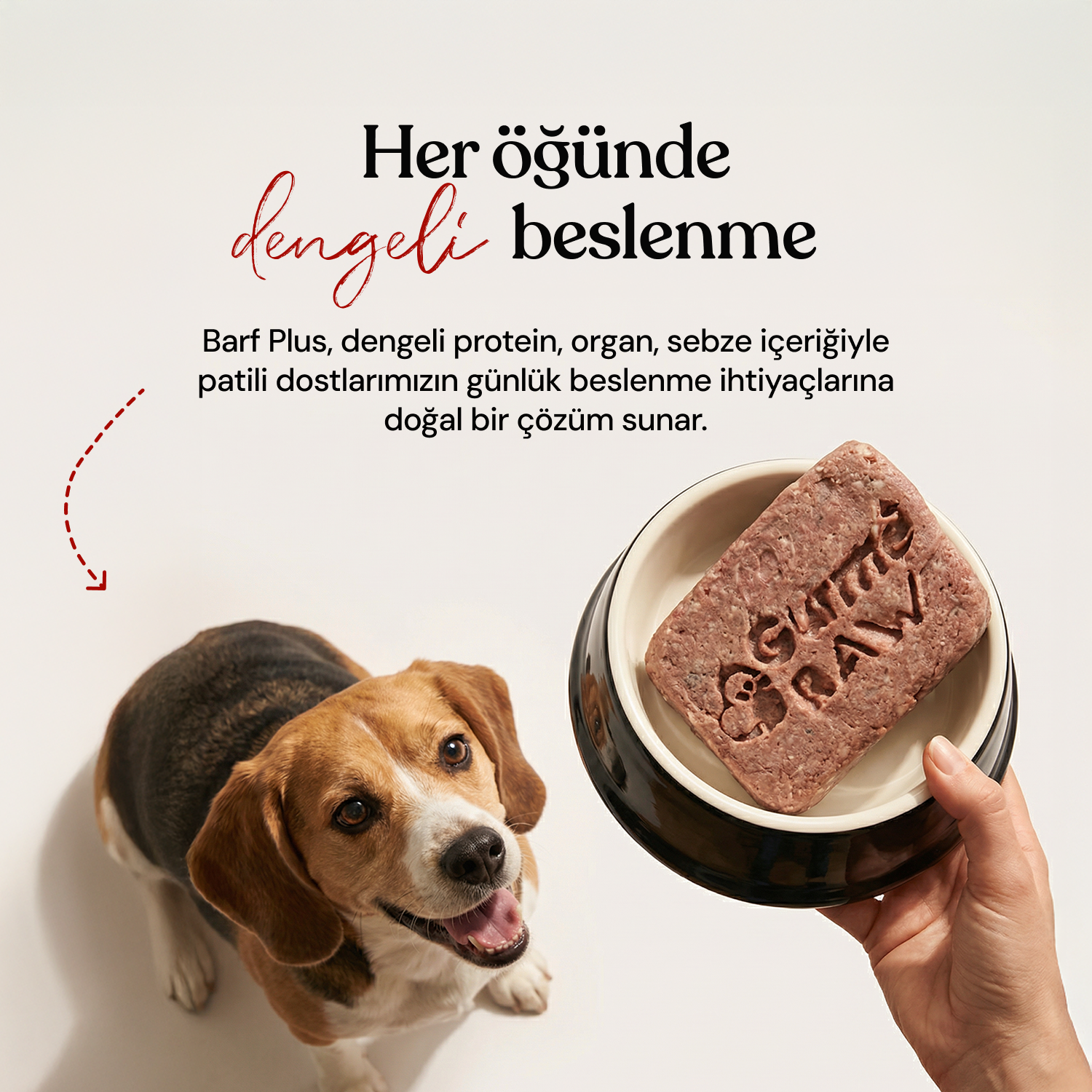 BARF Plus, günlük beslenme için tasarlanmış standart seviye çiğ köpek mamasıdır. Tavuk boynu ve dana etleriyle hazırlanır; meyve ve sebze içeriğiyle beslenme çeşitliliği sunar. BARF beslenmeye alışkın köpekler için pratik ve dengeli bir alternatif olup, düzenli kullanım için uygundur.