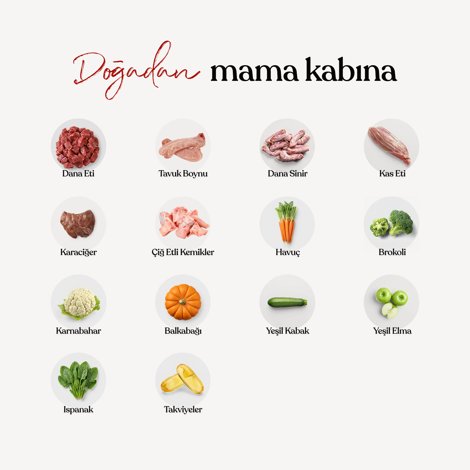 BARF Plus, kas eti, çiğ etli kemikler, dana eti, dana sinir, tavuk boynu ve hindi boynu gibi