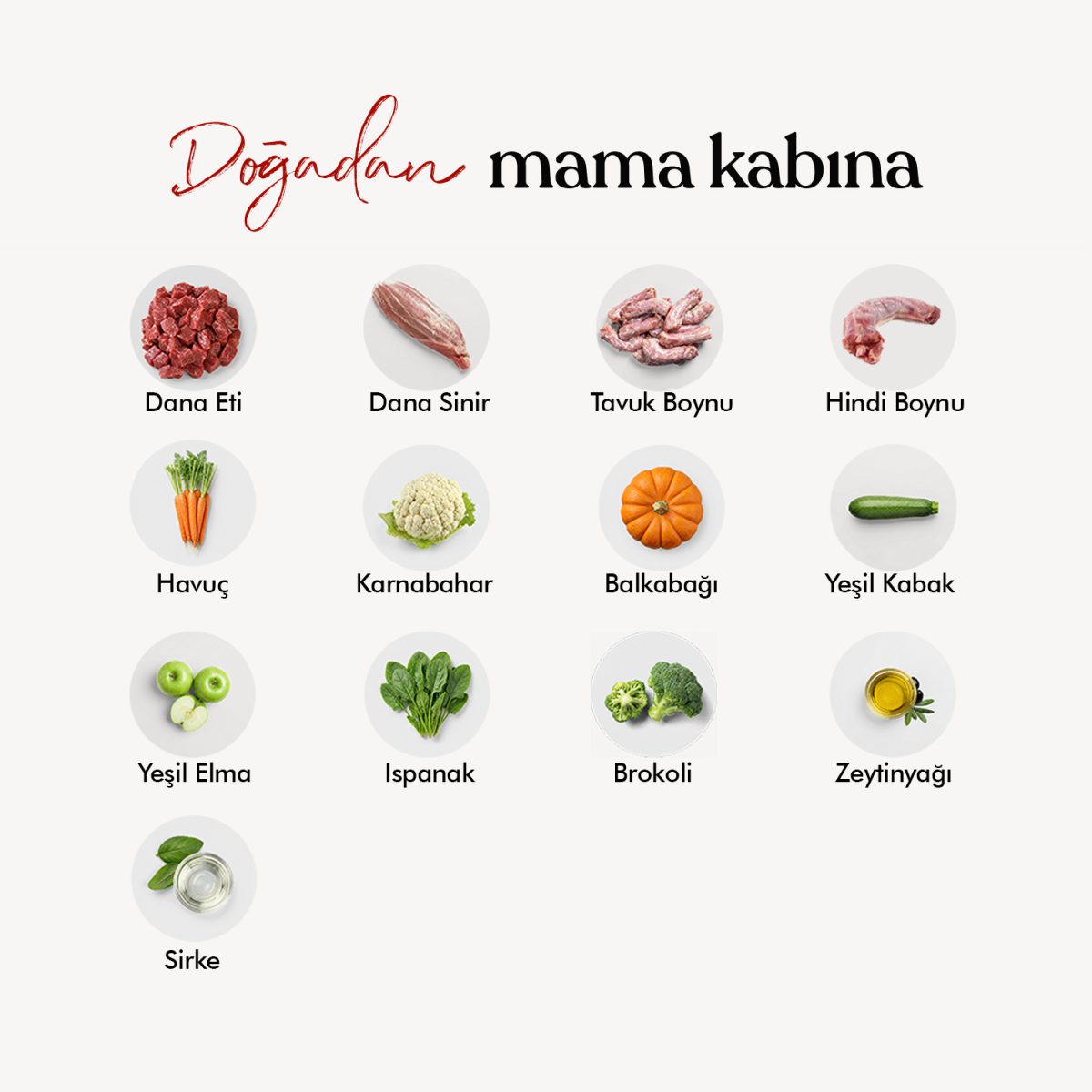 Çiğ etli kemikler ve dana eti gibi temel protein kaynaklarının yanı sıra havuç, brokoli, karnabahar, balkabağı, yeşil kabak, elma ve ıspanak gibi zengin meyve-sebze içeriğiyle yüksek vitamin ve mineral değerleri sunar.