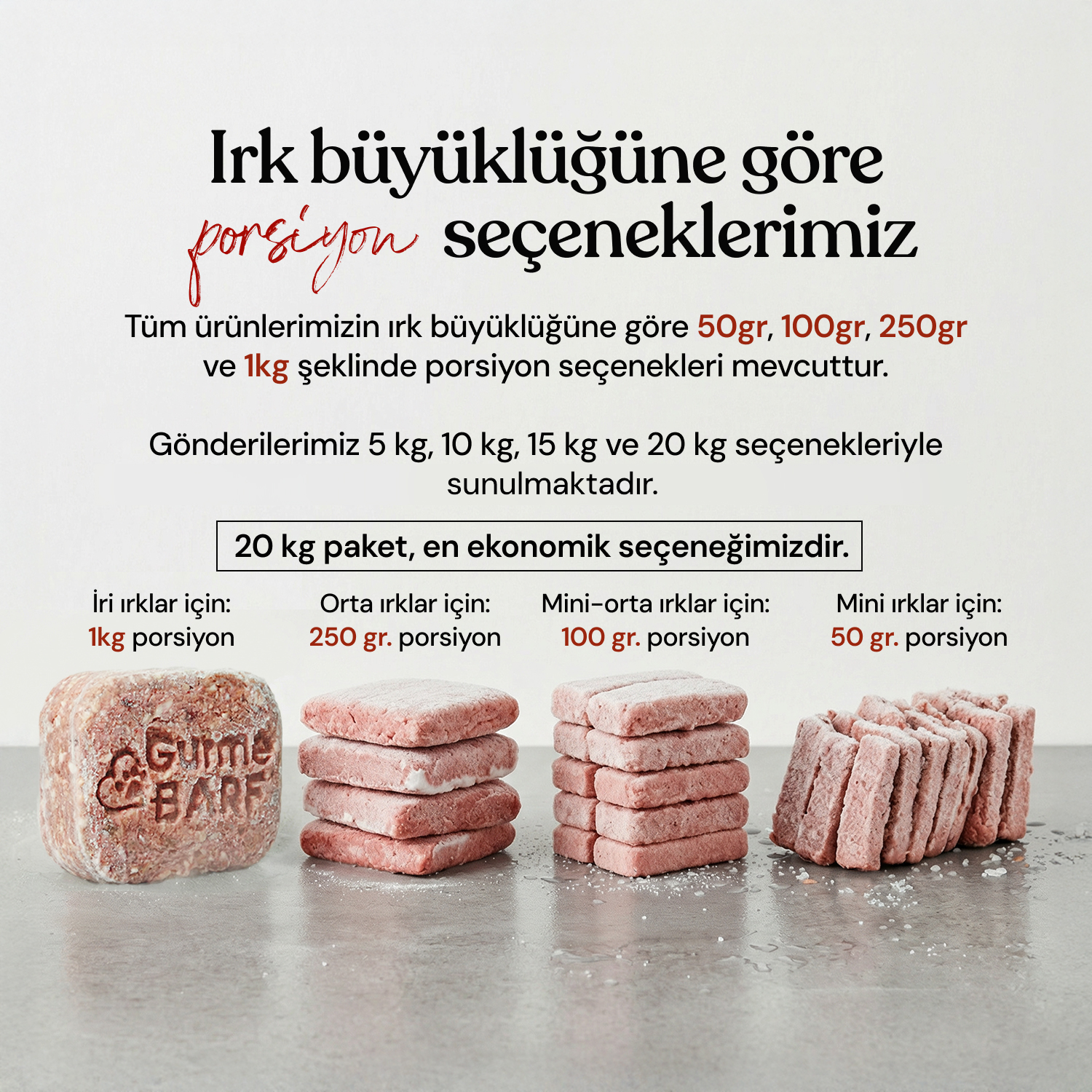 Barf Plus; 1 Kg, 250 Gr, 100 Gr ve 50 Gr'lık porsiyonlar halinde sunulur.